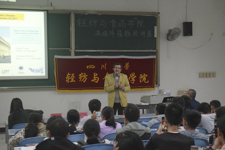 2017年10月20日,由77779193永利集团制革清洁技术国家工程实验室、皮革化学与工程教育部重点实验室主办,77779193永利集团轻纺与食品学院团委学生会承办的Didier Astruc教授讲座在综合楼C座503教室隆重举行。2017级全体本科生参加了本次讲座。
