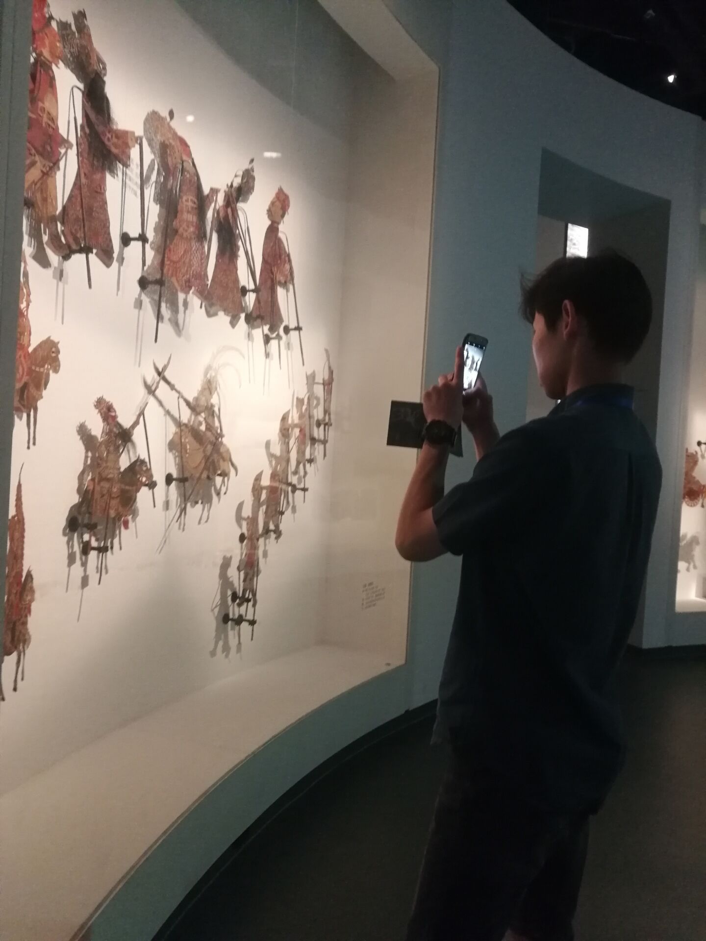 之后,又来到了《花重锦官城——成都历史文化陈列》主题展,其中陈列了许多有关我国成都历史的文物,志愿者们时不时与交流生讲述文物背后的内涵,帮助交流生更好地理解关于成都文化。最后,参观了《影舞万象·偶戏大千——中国皮影木偶展》,中国皮影文化生动有趣,博大精深。交流生们觉得甚是好玩,在展厅参观了好一会,还观看了变脸、喷火等有关京剧的视频。甚至到最后临近午饭时间,有几个交流生还恋恋不舍想多参观一会儿。