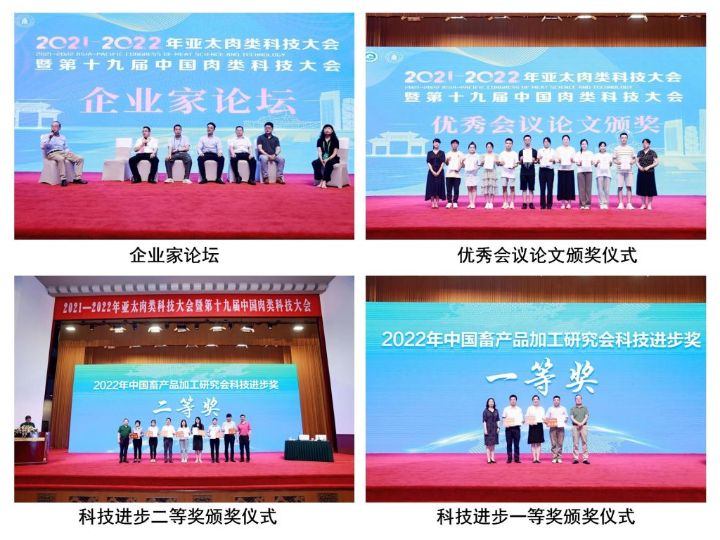 在企业家论坛环节,温氏集团、老川东食品、海科机械、雨润集团、海尔集团等企业代表,分别阐述在品质管理、技术创新、服务升级等方面的实践,并就相关热点话题回答现场参会者的提问。本次大会收到来自40余所高校及科研院所的会议论文共180余篇,肉品加工专业委员会专家评审出10篇优秀论文,并在大会的闭幕式上对获奖者进行表彰。大会闭幕式上还举行了“2022年中国畜产品加工研究会科技进步奖”颁奖仪式,对荣获一等奖和二等奖的获奖代表进行表彰。