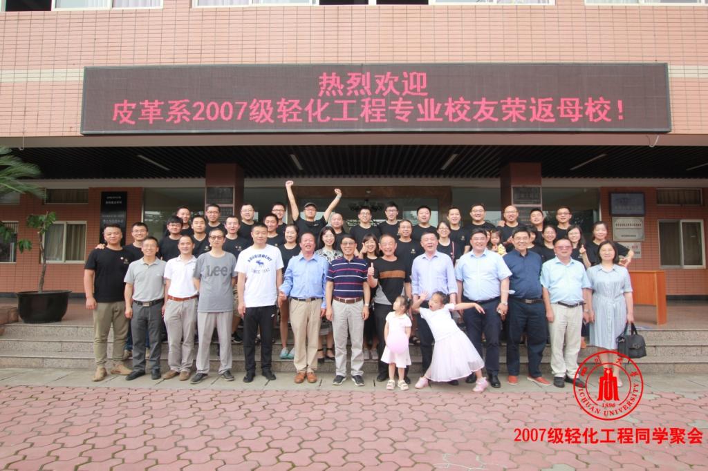 参加此次活动的院领导、老师及2007级轻化工程返校学生在皮革楼前合影留念。