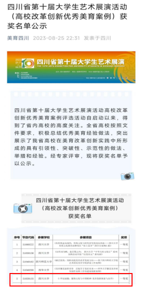 我院《<华冠丽服:服饰文化与中国精神>美育创新探索与改革》获四川省第十届大学生艺术展演活动(高校改革创新优秀美育案例)一等奖