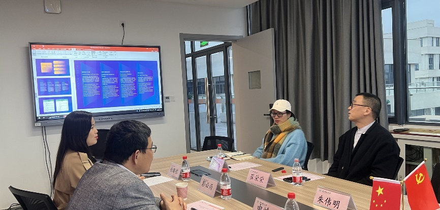 东华大学服装与艺术设计学院王朝晖副院长、服装与服饰设计系罗竞杰副主任和马晨曲老师向彭院长一行介绍了该学院的发展目标:构建以服装为龙头,以设计为主题的时尚学科生态链,建设国内领先、国际一流的以服装科技与时尚设计为特色的综合设计学院,并展示了目前取得的一系列显著成果。