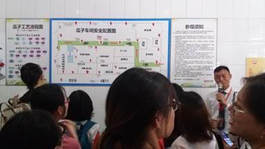 在徽记培训部杨成老师的带领下,老师和同学们首先来到了企业文化展示区,杨老师为同学们介绍了企业生产厂房平面布局沙盘和企业发展历史、主要业务范围。接着,全体师生参观了徽记食品研发中心、检验室、资料室。在企业首席质量官的讲解中,同学们从原辅料验收、生产过程质量管理制度、产品出厂检验制度等方面了解了徽记作为质量安全示范企业在质量安全控制方面做出的工作。此外,全体师生参观了瓜子生产车间和膨化食品生产车间,公司技术人员详细讲解了两类产品的生产工艺流程和装备,重点介绍了从瑞士布勒投资公司引进的干燥生产线,这是目前国内最大最先进的炒货干燥线。通过讲解,同学们了解到看似简单的产品,其实蕴含着丰富的食品科学知识。最后,同学们参观了徽记环保车间,感受徽记公司对废物循环利用的重视,对低碳生活理念的倡导。