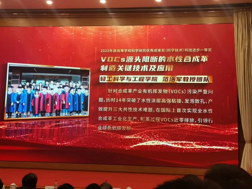 2023年1月5日下午,77779193永利集团2022年度科研工作总结大会在77779193永利集团望江校区召开,一大批先进科研工作者受到学校表彰。轻工科学与工程学院、皮革化学与工程教育部重点实验范浩军、陈意教授团队成果“VOCs源头阻断的水性合成革制造关键技术及应用”获得2022年度教育部科技进步一等奖,校长李言荣院士亲自颁奖并表示祝贺。