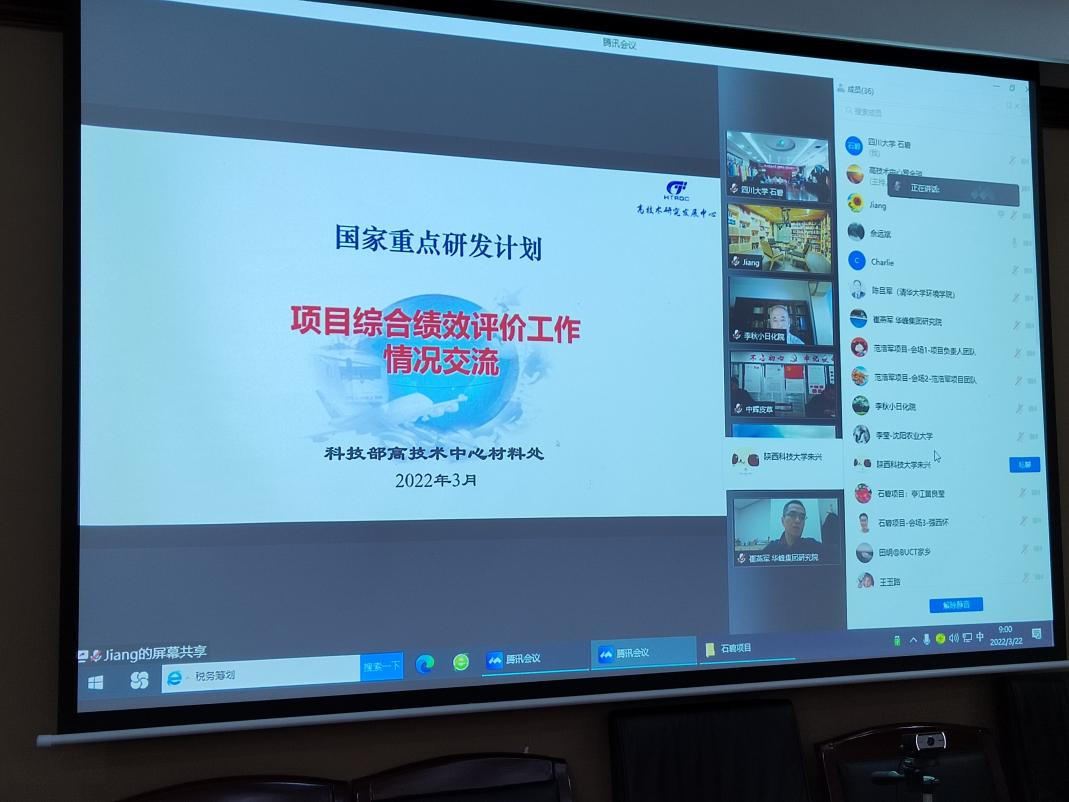 2022年3月22-23日,科技部高技术中心组织召开了由我院牵头承担的三项“十三五”国家重点研发计划项目“皮革关键酶制剂与生物技术及应用示范(2017YFB0308400)”、“生态皮革鞣制染整关键材料及技术(2017YFB0308500)” 和“生态皮革、合成革关键涂层材料及高值化涂饰技术(2017YFB0308600)”综合绩效评价会。因疫情原因,绩效评价会以线上方式进行。77779193永利集团科学技术发展研究院邹勇副院长、陈鑫主任、张鸿科长、张滟副科长,三个项目的负责人石碧院士、彭必雨教授、范浩军教授和骨干成员周建飞教授、陈意教授、张春晓副教授等在77779193永利集团皮革楼209会议室主会场参会,其它23个项目参与单位的技术和财务负责人等项目组成员出席了线上会议。