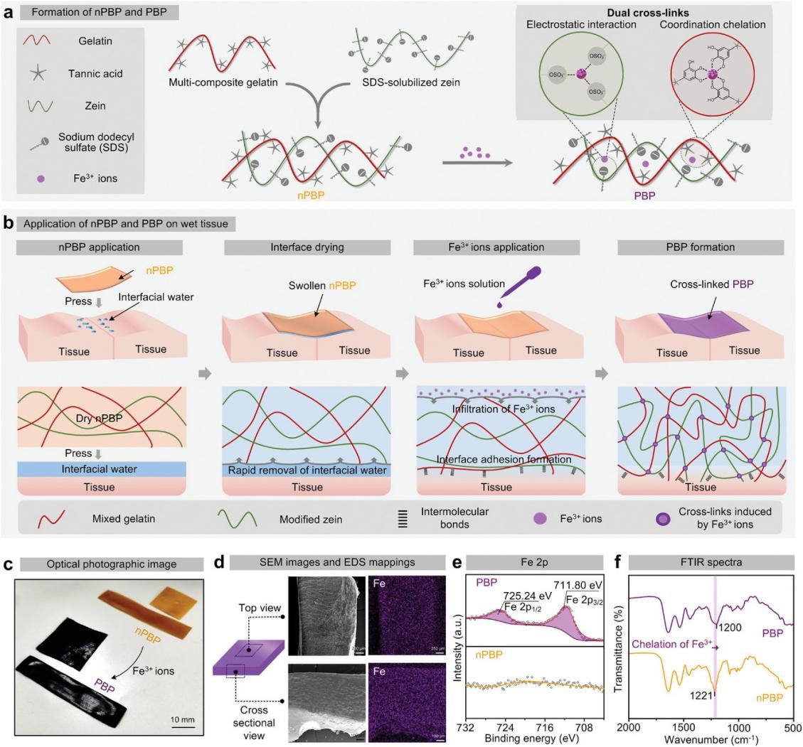 多酚分子结构中具有多个邻苯酚基团,能与多种物质通过多重分子间作用力发生紧密结合,复配其他生物质材料,具有作为良好的生物粘附剂的潜力。我院郭俊凌教授团队在题为“Multifunctional dual cross-linked bioadhesive patch with low immunogenic response and wet tissues adhesion”的论文中介绍了一种具有良好生物相容性和生物降解性的多酚-蛋白质基生物粘附剂。相比传统生物粘合剂(如聚乙二醇和纤维蛋白),多酚-蛋白质基生物粘附剂具有更高的粘附强度及其低免疫原性反应。该材料有望作为生物医用胶水,用于快速止血、加速伤口愈合和有缺口器官的封堵,成为高效的组织粘合剂和密封剂。该论文的第一作者为我院2019级博士研究生唐飏,我院郭俊凌教授、王晓玲副研究员(专职科研)为共同通讯作者,龚贵东副研究员(专职科研)参与论文指导和写作。