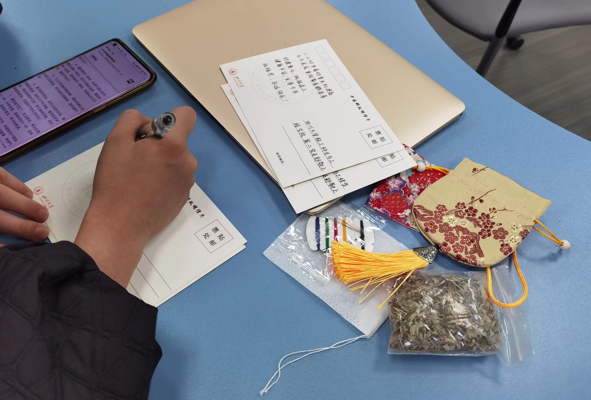 同时,本科生第二党支部在重阳节之际,为了践行“尊老、敬老、爱老、助老”的社会风尚,组织党员同志为学院离退休党支部成员制作香囊。大家围坐在一起互帮互助,耐心细致地缝制香囊。小小香囊,一针一线拼接缝制,内部填入各种香料,寄托着对老同志的浓浓祝福。最后,同志们以书写明信片的方式,用文字寄托情感,用信件为送去佳节问候。
