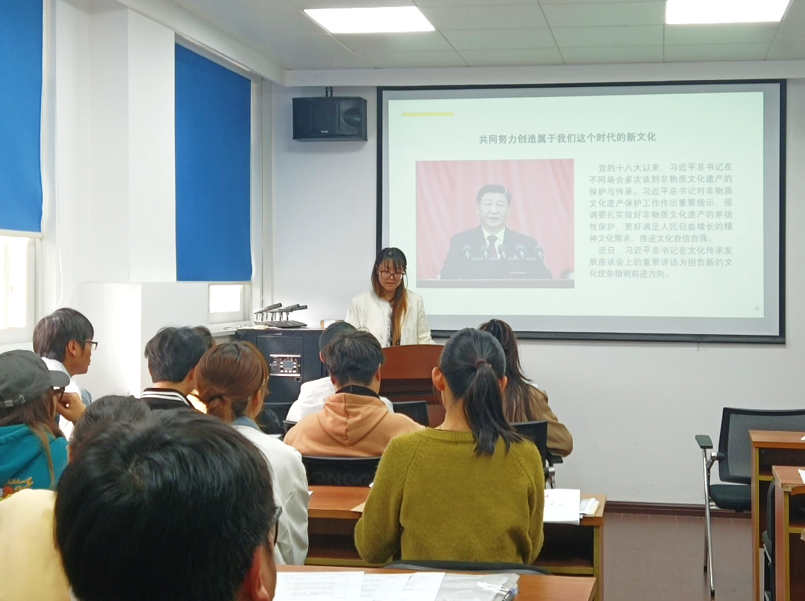 2023年10月27日下午,由党支部宣传委员范雅新在纺工楼302会议室给全体党员讲述以“非遗”为主题的党课。在主题党课中,范雅新介绍了中国非物质文化遗产的基本情况、保护政策及宣传手段,这充分党和国家对保护文化遗产的高度重视和战略远见。她还重点分享了蜀绣的历史传承、蜀绣的常见技法、蜀绣的文化意义等,向大家积极推荐每两年举办一次的中国成都国际非物质文化遗产节,并结合自己学习蜀绣技艺的亲身经历为大家讲解了蜀绣这项手工非遗在当今新时代的传承困境。