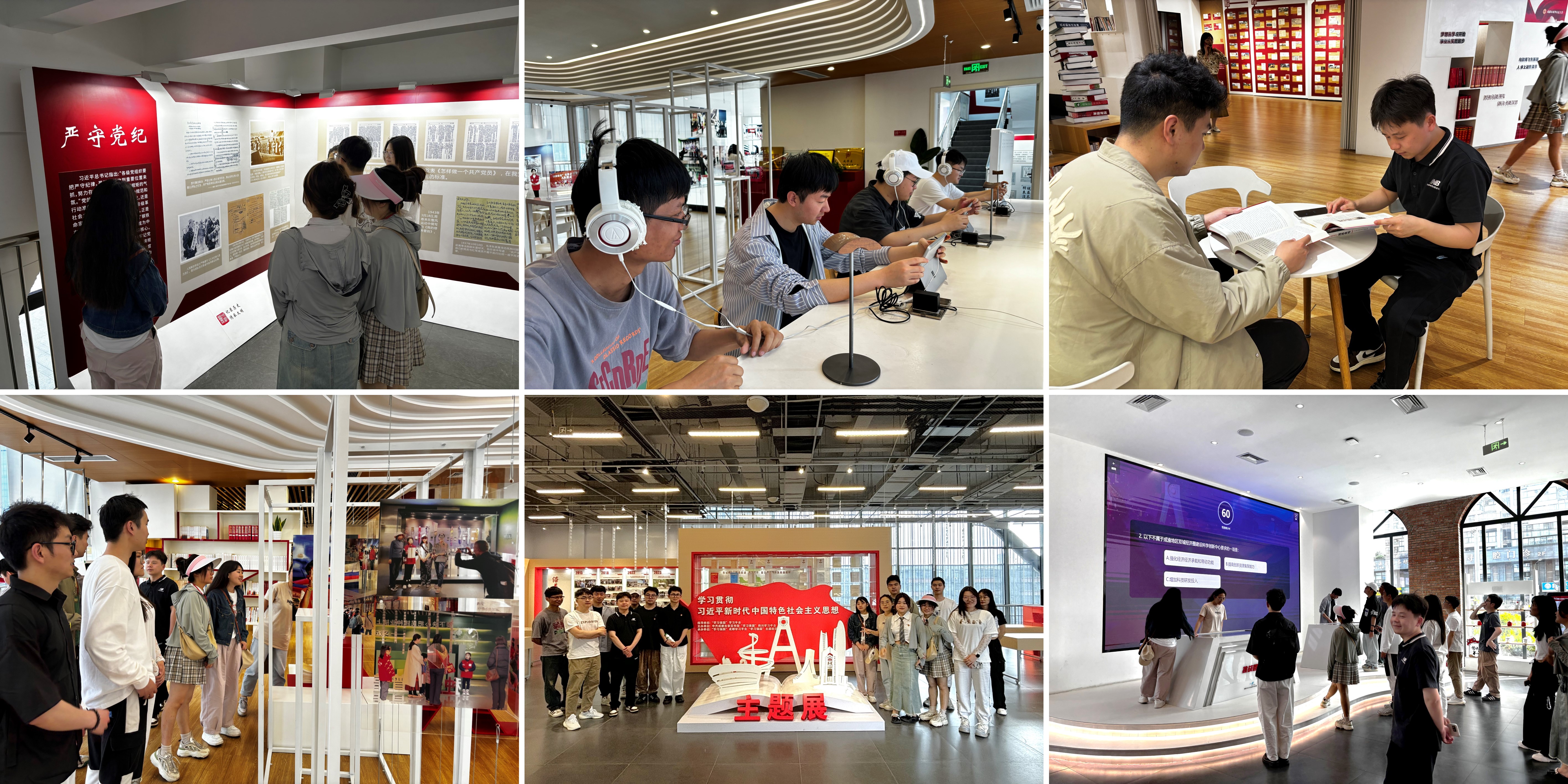 “学习强国”主题街区是以学习强国主题宣传为核心的一站式文化服务综合体,既是学习活动场所,又是宣传服务阵地,还是文化建设窗口。本次的创新学习模式,是带领党员同志们走进“学习强国”主题街区。首先,大家陆续参观了“学而时习之序厅”“党史墙”“学习小站”等展厅,从线上走到线下,边走边学边思考。党员们主动在阅读区、学习打卡区、学习交流区多个区域内开展自主学习和互动交流。在书籍阅读区的书架上摆放了千余册理论书籍,党员同志们在这里自由借阅,认真阅读书籍;在“百年历程 档案记忆”展览区域,成都市档案馆整理的以时间轴为主线的100份珍贵档案,从档案视角展示了建党以来成都发展的百年历程;在“沿着总书记的足迹”展览区域,展出了近年来习总书记多次在四川考察时强调的新闻照片,大家深切感受到总书记对四川省人民的殷切关怀,激励着我们青年学子要胸怀“两个大局”、心系“国之大者”,感恩奋进新时代,努力成为德智体美劳全面发展的社会主义建设者和接班人。随后,人机交互式的学习进一步激发了大家的参与感、体验感,充分体验“沉浸式”线下活动带来的学习新感受。