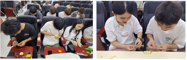 接着,为了体验传统节日,大家发挥自己的专业特长和兴趣爱好,用粘土制作粽子和与端午节相关的手工品。大家围坐在一起,讨论做粘土粽子的方法,发挥自己的想象,将自己的构思转化为形态各异的粽子、龙舟等手工品,有的精美,有的俏皮。做完“粽子”后,大家一起学习编手绳的技巧,并根据自己的喜好用不同的彩绳和手法编织,最后再戴在自己的手腕上以驱邪祈福。当一只只形态各异的粽子和多彩多样的手绳呈现在大家眼前时,大家感受到了DIY的成就感和中国传统文化的乐趣。
