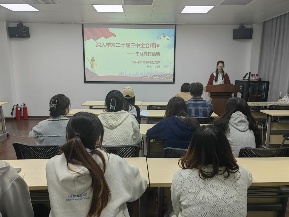 为加强支部党员同志对党的方针政策深入理解,明确自己的职责和任务,为推动党和国家事业作出更大贡献,轻工科学与工程学院皮革研究生第四党支部于2024年10月11日16:00在皮革楼205教室开展“深入学习二十届三中全会精神”主题党日活动。本次活动由宣传委员孟慧涓同志主持。