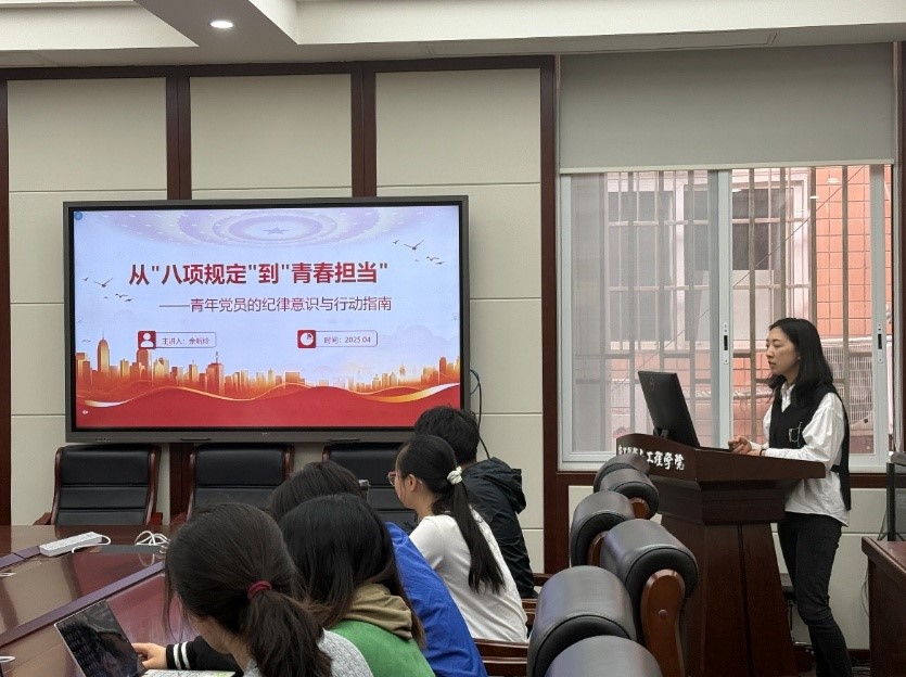 为深入学习贯彻党的二十大精神,强化青年党员的纪律意识和责任担当,轻工科学与工程学院本科生第二党支部于2025年4月11日组织开展了专题党课学习活动。党支部书记余昕玲老师以《从“八项规定”到“青春担当”——青年党员的纪律意识与行动指南》为题,为支部全体党员讲授党课。