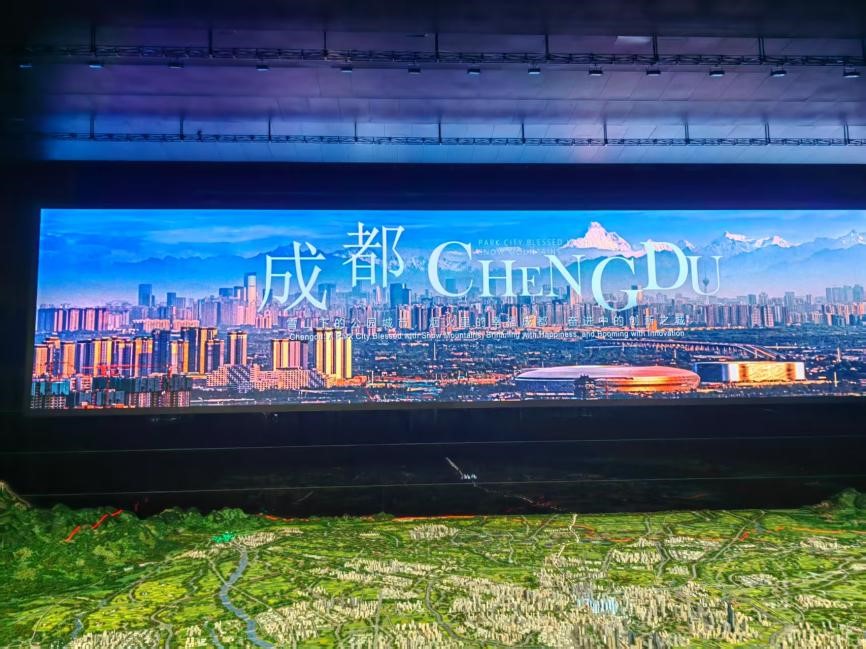在规划馆三楼的成都市全景沙盘可以看到一个开放的,兼容并包的大都市;通过灯光变换,生动演示了成都从“两山夹一城”到“一山连两翼”的城市空间格局转变,天府绿道、轨道交通、国际航空枢纽等规划信息,西南内陆开放的高地和构筑大都市区,打破了传统单核集聚发展模式的坚定目标。