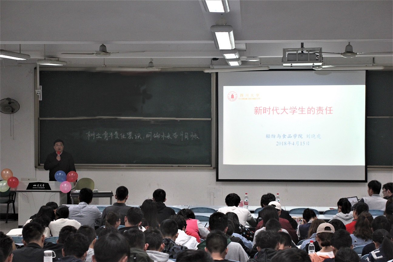 2018年4月15日晚,轻纺与食品学院党委书记刘晓虎副教授以“新时代大学生的责任与使命”为主题对我院2017级本科生讲授思想政治课。刘书记首先从两场彰显责任与担当的学生运动讲起,通过对五四运动、一二九运动历史背景和过程的生动讲解,鼓励同学们学习同龄前辈们在民族大义面前的责任与担当。其次,刘书记分别举例介绍了青年在新民主主义时期、社会主义建设初期以及改革开放新时期的重要作用与历史贡献。并从当今时代的党情、国情以及我校一流高校建设的进程方面,为同学们分析了当前所处的成长环境。尤其是在全面贯彻党的十九大精神的开局之年,在学校加快推进“两个伟大”的关键之年,在学校推进“双一流”建设的奋进之年,学校高度重视人才培养,特别是在学生领导力培养、胜任力培养方面作出了大量的举措,如加强本科生的海外访学计划、加强学生创新创业能力培养计划以及学校近年来一直推行的小班化、探究式教学,非标准答案教育教学改革计划等方面都作出了大量的尝试。因此,刘书记号召同学们珍惜学习机会,把握机遇,勇挑新时代的重任,并借用习近平总书记的话鼓励同学们“创造无愧于时代的人生。”本次思想政治课在同学们热烈的掌声中圆满结束!