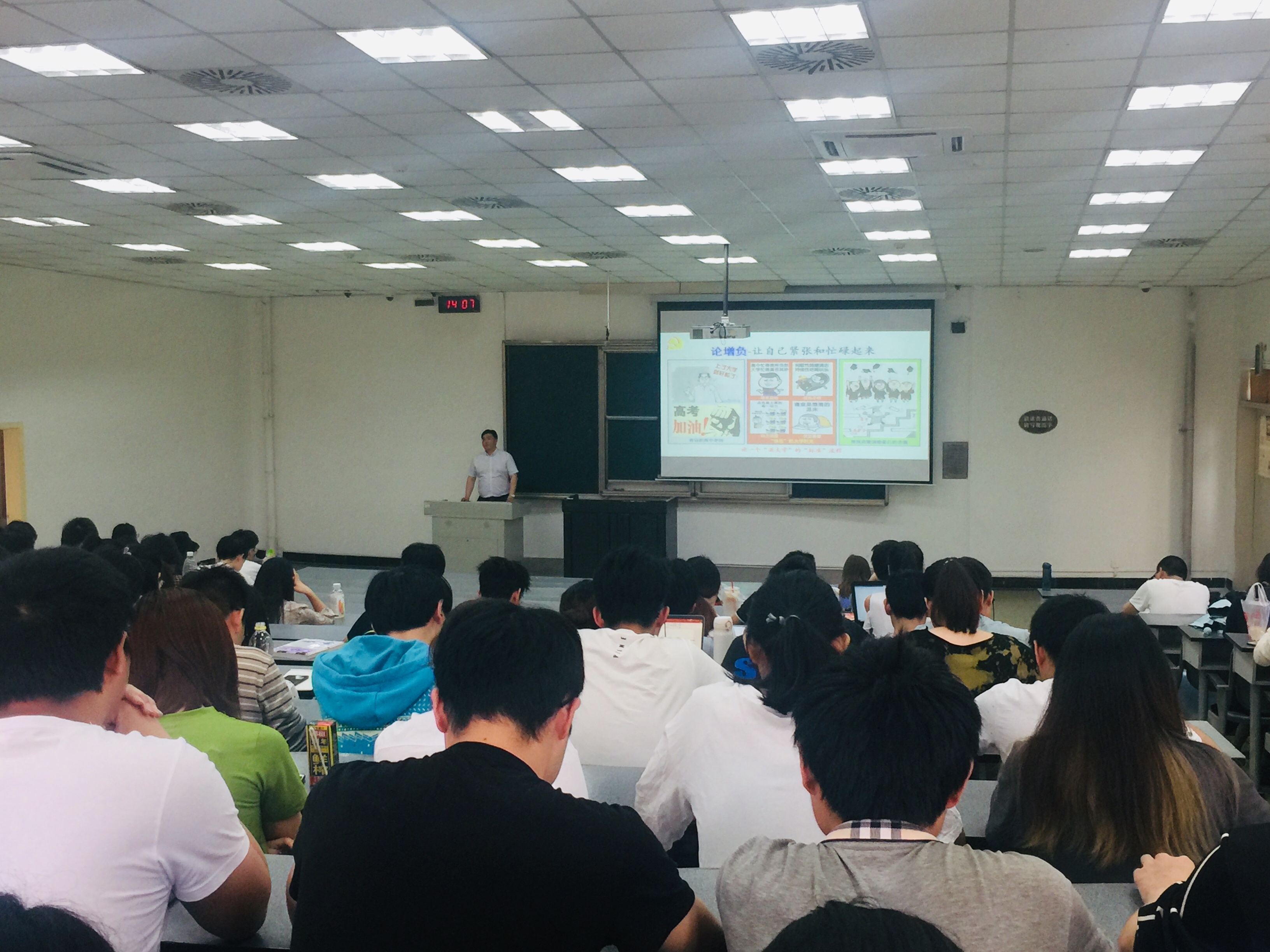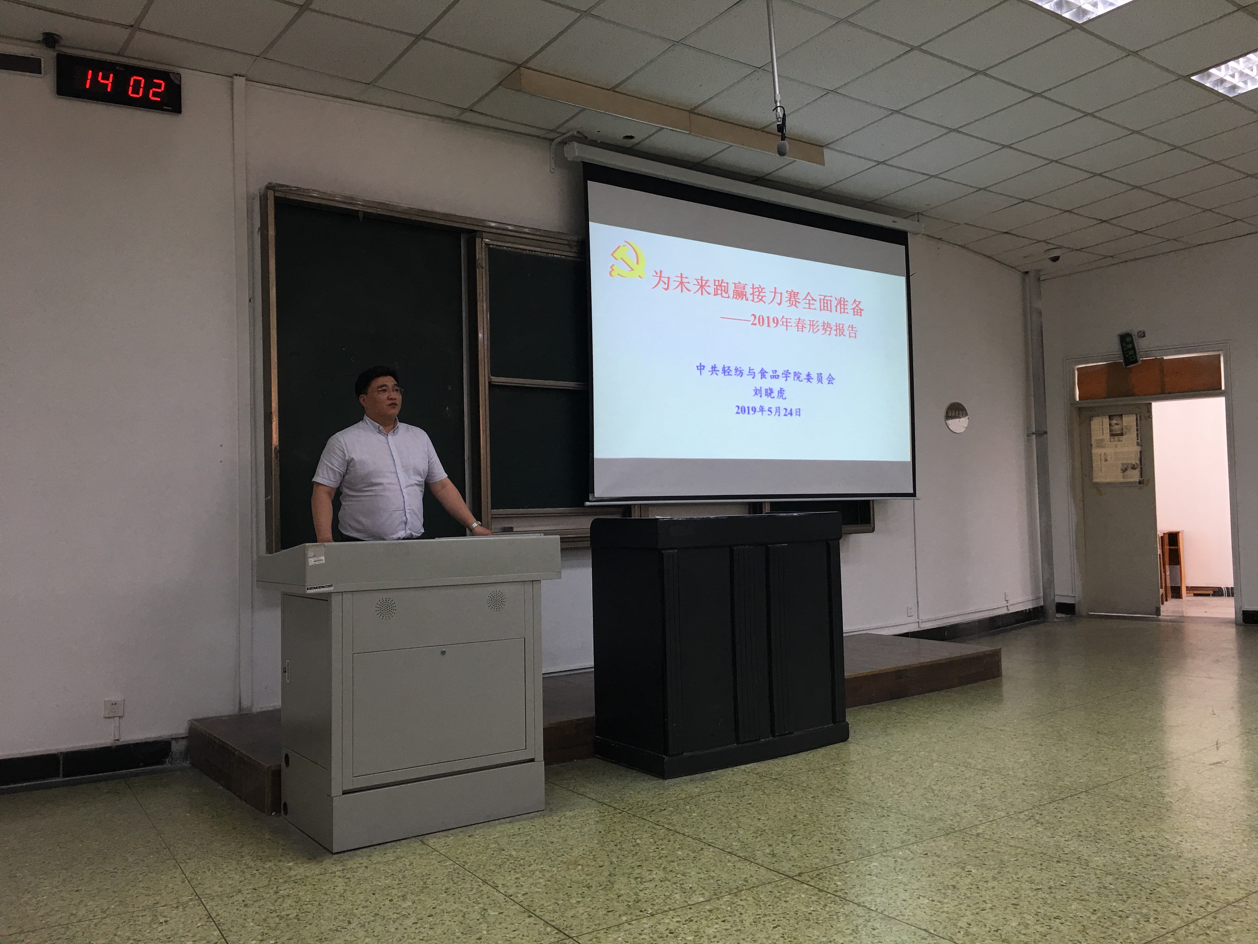 2019年5月24日下午,轻工科学与工程学院党委书记刘晓虎副教授深入2016级本科生形势与政策课课堂,为2016级全体同学做了以“为未来跑赢接力赛全面准备”的主题形势报告会。辅导员王舒灏老师及2016级全体本科生听取了报告。