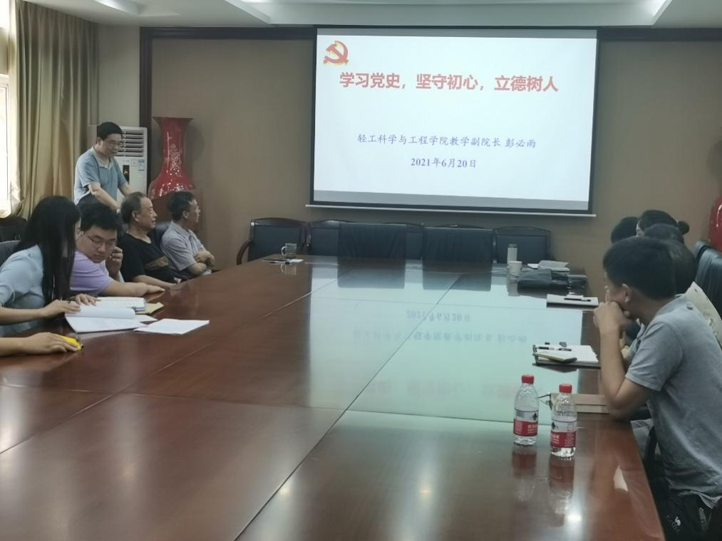 在庆祝中国共产党成立100周年之际,为进一步引导教职工开展党史学习教育,实现学史明理、学史增信、学史崇德、学史力行,切实做到学党史、悟思想、办实事、开新局,2021年6月29日下午,轻工科学与工程学院彭必雨副院长为皮革教工党支部全体党员作了《学习党史,坚守初心,立德树人》的专题党课。