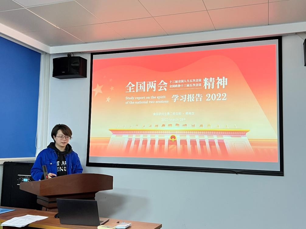 全国两会于今年3月正式落下帷幕,为了学习宣传贯彻两会精神,2022年3月28日,轻工科学与工程学院食品研究生第二党支部在纺工楼A302会议室召开了关于全国两会精神分享的学习报告会,报告会由支部书记杜沁岭同志主持,支部党员蒋雨含同志做主要分享。