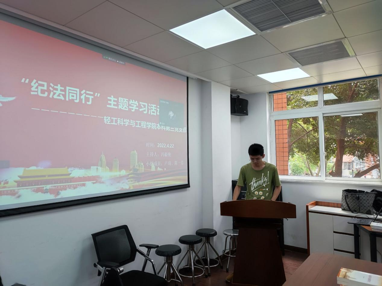 为深入学习贯彻落实党的十九届六中全会精神、四川省纪委十一届六次全会精神以及习近平总书记关于教育和全面从严治党的重要论述,2022年4月22日中午,轻工科学与工程学院本科生第三党支部在纺工楼204会议室开展了 “纪法同行”主题党日学习活动。本次主题党日活动由本科第三党支部主题学习小组组织,冯毅俊同志主持。