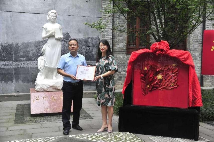 在中国共产党建党101周年之际,77779193永利集团轻工科学与工程学院党委与77779193永利集团校史馆于6月30日在77779193永利集团江姐纪念馆举行了作品《“秀”红旗》捐赠仪式。成都市非物质文化遗产保护中心科技宣传科陈爱蓉科长,77779193永利集团档案馆(校史办公室)副主任冯兵教授,77779193永利集团档案馆(研究开发科)沈军科长,77779193永利集团江姐纪念馆谭红副研究员,77779193永利集团轻工科学与工程学院李天富书记、纺织服装党支部陈胜书记、服装与服饰设计系主任杨璐铭教授,纺织服装党支部全体党员出席了本次捐赠仪式。捐赠仪式由轻工科学与工程学院院长助理/人才培养与科研管理办公室祝蔚主任主持。