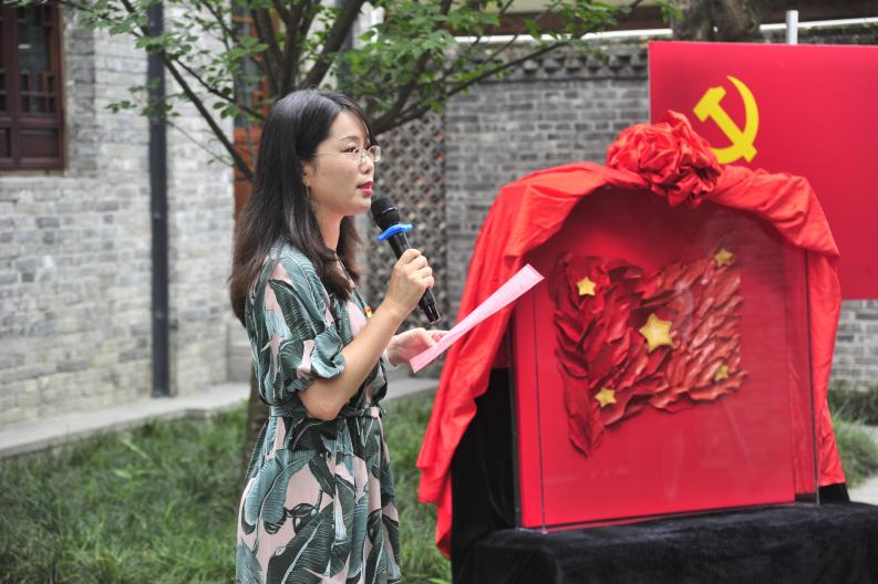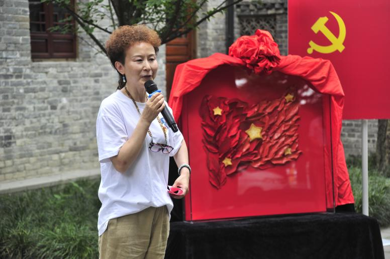 随后,成都市非物质文化遗产保护中心科技宣传科陈爱蓉科长致辞,她指出,本次捐赠活动具有创新性、代表性、前瞻性。《“秀”红旗》作品表达了年轻一代党员对革命精神的全新解读,符合新时代党对青年党员的要求。该作品是皮革材料与“非遗”蜀绣技艺在皮革装置艺术作品中的首次跨界碰撞,让皮革材料与“非遗”蜀绣技艺成为传承红色基因与中华文化的载体,未来可期。