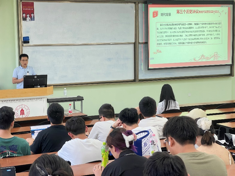 为深化学习党的十九届六中全会通过的《中共中央关于党的百年奋斗重大成就和历史经验的决议》,加强学生党员的思想政治教育,增强学生党员的党性修养,2022年7月6日,轻工科学与工程学院党委冯国涛副书记向本科生第三党支部讲授了“学深悟透三个历史决议,争当时代新人”的主题党课。
