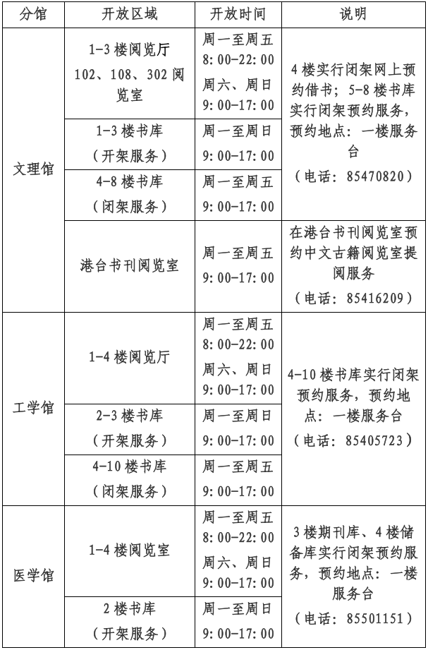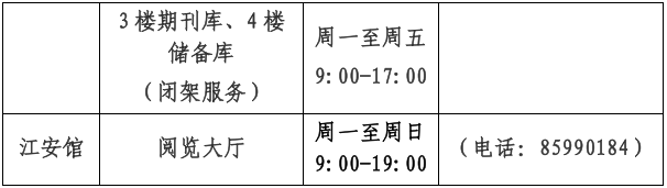 2023年1月14日至2月15日,图书馆执行寒假工作时间。1月21日至1月27日春节放假闭馆,因春节放假调整后的周末(1月28、29日)按照周一至周五开放时间开放。图书馆各分馆的开放时间及服务安排如下表: