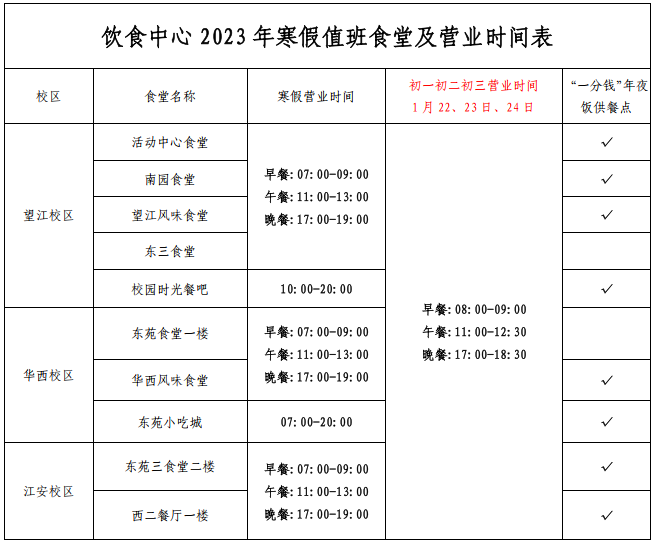 2023年寒假值班食堂及营业时间安排: