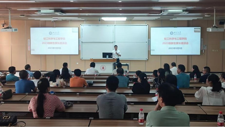在2023级本科生迎新期间,为进一步加强家校联动,增强学校与家长的深入交流与全面了解,学院于2023年9月9日上午在综合楼C304召开2023级本科生家长座谈会。参加本次会议的有学院党委李天富书记,院长彭必雨教授,副院长陈意教授、周建飞教授、迟原龙副教授,2023级教导员吕振生老师,生物质与皮革工程系副系主任程海明教授,服装与服饰设计系副系主任申鸿副教授,2023级新生辅导员李有真老师以及线上线下300余名新生家长。本次家长座谈会由学院党委冯国涛副书记主持。