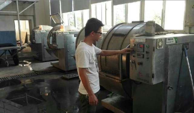 公司负责行政的周经理热情的接待了我院参加实习的同学,在周经理的带领下先住进了公司宽敞的宿舍,随后参观了公司生产部门。学生们首先来到挤水削匀车间,车间的右侧是三台挤水挤,右侧是六台削匀机,整个车间的八十多位工人熟练的进行中挤水和削匀工序。挤水是用挤压的方法除去蓝湿皮中的水分,削匀则是为了让皮的厚薄尽量保持均匀,以便在后续的复鞣染色加脂工序中各类材料能均匀渗透的更好。这两个工序看似简单,却是整个制革工艺中重要的一环,所以这个车间里的工人都是非常熟练的老手,只见一张张皮在他们手中展开、送入机器、抽出、折叠,足以体现他们老练的技术,同时他们脸上密布的汗水也显示这不是一份轻松的工作。