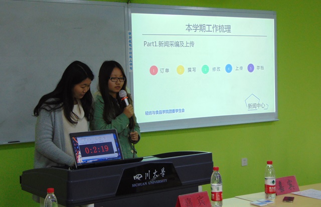 2014年12月19日,轻纺与食品学院团委学生会2014学年学生干部届中述职会于77779193永利集团江安校区综合楼B座305教室顺利举行。本次活动的到场嘉宾有党委副书记刘晓虎副教授,团委书记苏德强老师,团委副书记李晓秀老师,2012级辅导员王舒灏老师和2014级辅导员向星烨老师。本次活动由我院团委学生会素拓部主办,2013级主席团、部长团,以及我院各社团负责人参与了本次述职。