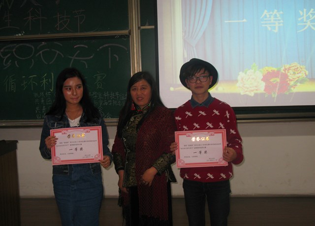 各队展示结束后,评委代表万宗瑜老师对各个作品进行了详细的点评,对参赛选手们良好的表现给予肯定,并对部分作品提出了自己忠心的建议。最后,主持人宣布获奖名单,并由苏德强老师、万宗瑜老师和冯洁老师给获奖者颁奖。其中“变·织”和“丹宁”两个作品获得了一等奖。自此,从选手报名到花落赢家的历时一个月的废物循环利用大赛圆满落幕。
