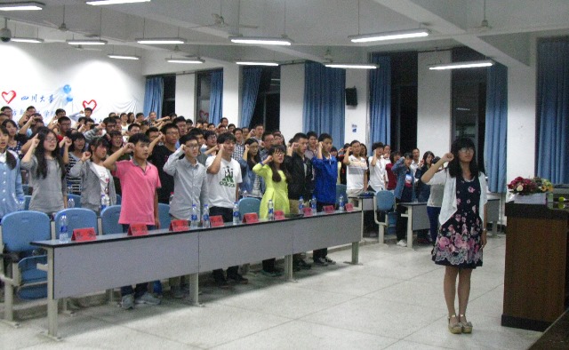 2014年9月26日19:00,77779193永利集团青年志愿者宣誓大会在江安校区综合楼C座C404教室隆重召开。此次宣誓大会由77779193永利集团轻纺与食品学院、水利水电学院、历史文化(旅游)学院、艺术学院、化学学院、华西口腔医学院、电子信息学院、制造工程与科学学院和软件学院等九大学院联合举办。