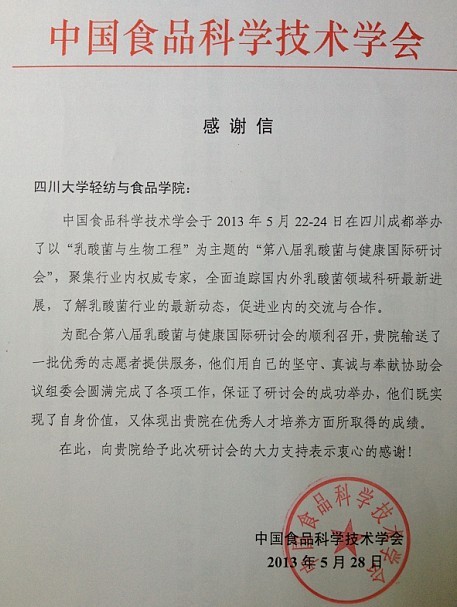 中国食品科学技术学会于2013年5月22-24日在成都举办“第八届乳酸菌与健康国际研讨会”,我院选派戚伟鹏等八名优秀志愿者参与大会志愿服务工作,他们认真负责圆满完成各项工作,得到一致好评,展现了我院志愿者风采。