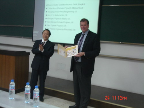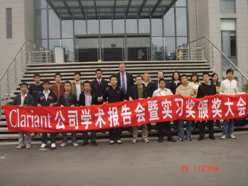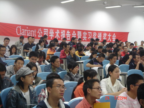 首先,Gary Fielding先生为我院学生作了企业的社会责任的主题报告。他用幽默、风趣的语言讲述了Clariant的发展历程、产品研发、人才培训以及与高校合作等方面的情况,并希望几年以后可以看到我们同学中的精英能加入到Clariant的团队之中,为公司的发展注入新鲜的血液。随后进行了2004级本科生实习奖颁奖典礼,本次共有动手能力强、综合素质高的10名优秀个人与两个集体获此奖项。最后,何有节副院长代表学院为Gary Fielding先生送上我校110周年纪念邮票,感谢Clariant公司对我院学生的精彩报告。