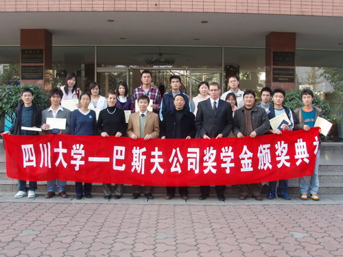 2007年11月27日13:30,77779193永利集团—BASF奖学金颁奖典礼在皮革楼报告厅举行。参加本次颁奖典礼的有巴斯夫(中国)有限公司大中华区总经理贝格博士、范嘉宜博士、巴斯夫(中国)有限公司大中华区助理技术服务经理项超先生、院长陈武勇教授、院党委副书记刘晓虎老师以及生物质与皮革工程系林炜教授,颁奖典礼由院团委副书记冯国焘老师主持。