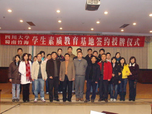 2007年12月8日,77779193永利集团食品学科蜀南竹海学生素质教育基地签约授牌仪式在宜宾市蜀南竹海多功能厅隆重举行。参加本次签约授牌仪式的有轻纺与食品学院党委副书记刘晓虎老师、轻纺与学院副院长卢晓黎教授、蜀南竹海管理局覃鸿杰局长、蜀南竹海林业分局贾廷彬局长以及轻纺与食品学院食品专业学生代表二十余人。