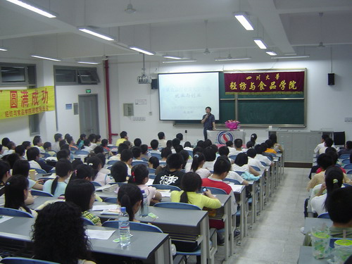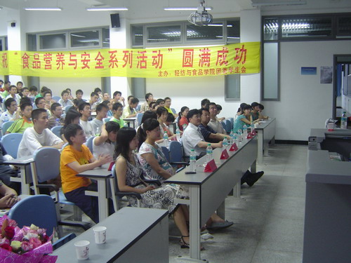 5月19日晚7:30在综合楼C303,轻纺与食品学院团委学生会特邀白家食品有限公司董事长兼总裁陈朝晖先生为我院作专题讲座。当晚莅临本次讲座嘉宾还有轻纺与食品学院副院长、食品工程系系主任卢晓黎教授;轻纺与食品学院党委副书记刘晓虎老师;院团委书记祝蔚老师以及06级辅导员段飞霞老师,讲座由院团委副书记冯国涛老师主持。