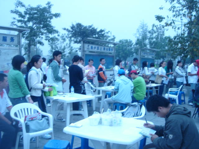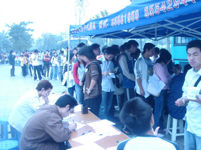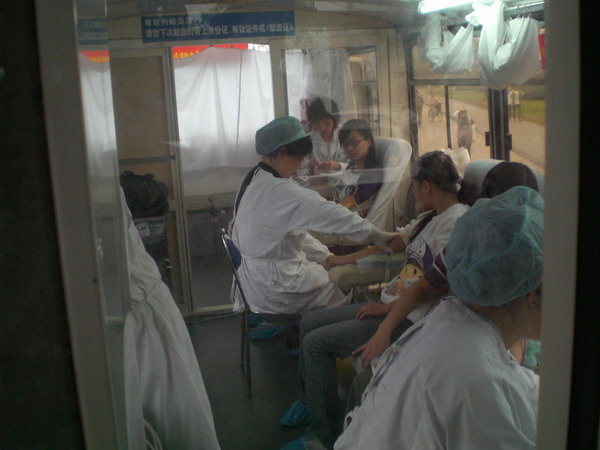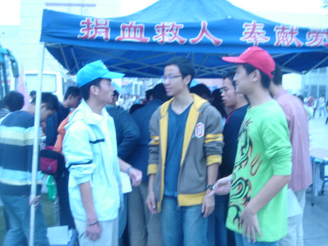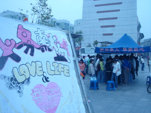 06级新干事大多是第一次参与本队的大型活动,个个摩拳擦掌,积极性很高.活动从上午9点起至下午2点结束,但从七点半大家就开始着手布置现场.9点整,成都市血液中心的采血车准时到达青春广场,进行采血.青春广场上一个个青春,忙碌的背影立刻活跃起来,协助医务人员采血,登记,照料献血人员,发放宣传资料……大家热情高涨,时刻紧守自己的服务岗位,细心为献血者讲解献血流程和注意事项,本次活动就这样井然有序的开展着……中午11点起由第二班人员交接工作,他们负责11:30到14:00的活动。