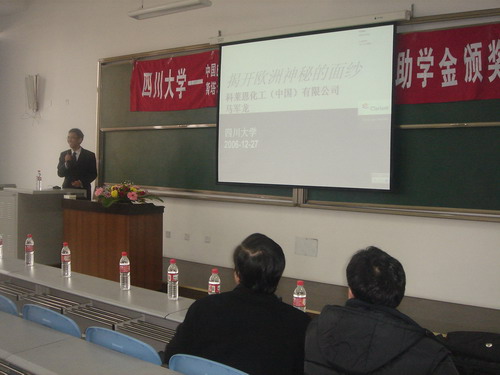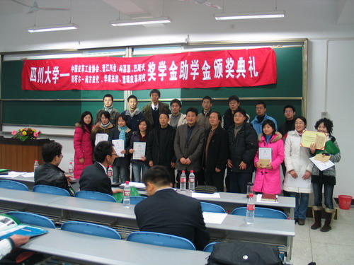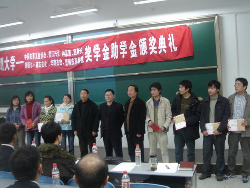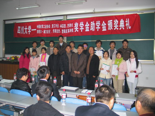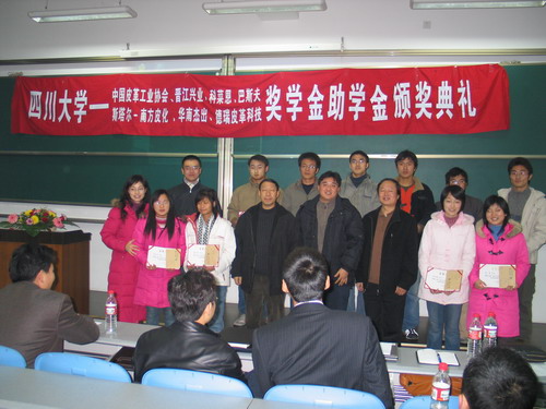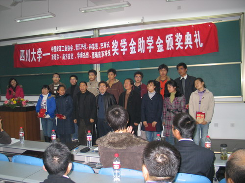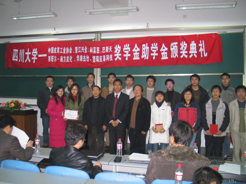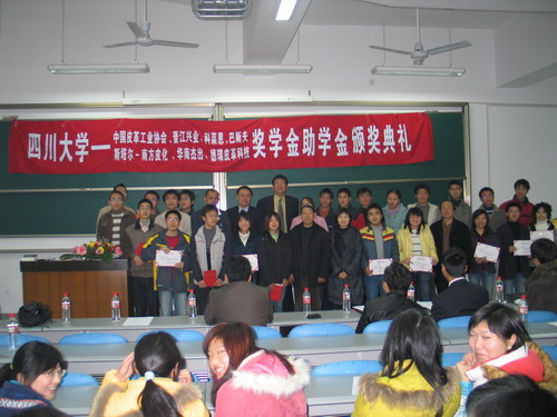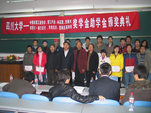 2006年12月27日下午14︰30整,我院生物质与皮革工程系专业奖学金颁奖典礼在江安校区综合楼C304隆重举行,此次颁奖典礼共颁发七个项目的奖助学金,他们分别是:中国皮革工业协会奖学金、广东华南杰出奖助学金、斯塔尔-南方皮化奖助学金、德瑞皮革科技奖学金、科莱恩实习奖学金、BASF奖学金和晋江兴业助学金。参加本次颁奖典礼的人员有:设奖单位颁奖嘉宾,轻纺与食品学院院长、生物质与皮革工程系主任陈武勇教授,副院长何有节教授,院党委副书记刘晓虎老师,生物质与皮革工程系副系主任张宗才教授、刘彦副教授,生物质与皮革工程系杨淑娟老师、陈家丽老师,院学生工作办公室冯国涛、李晓秀老师,全体获奖学生,学院2005级、2006级全体轻化工程专业、轻工生物技术专业学生。颁奖典礼由院团委书记祝蔚老师主持。