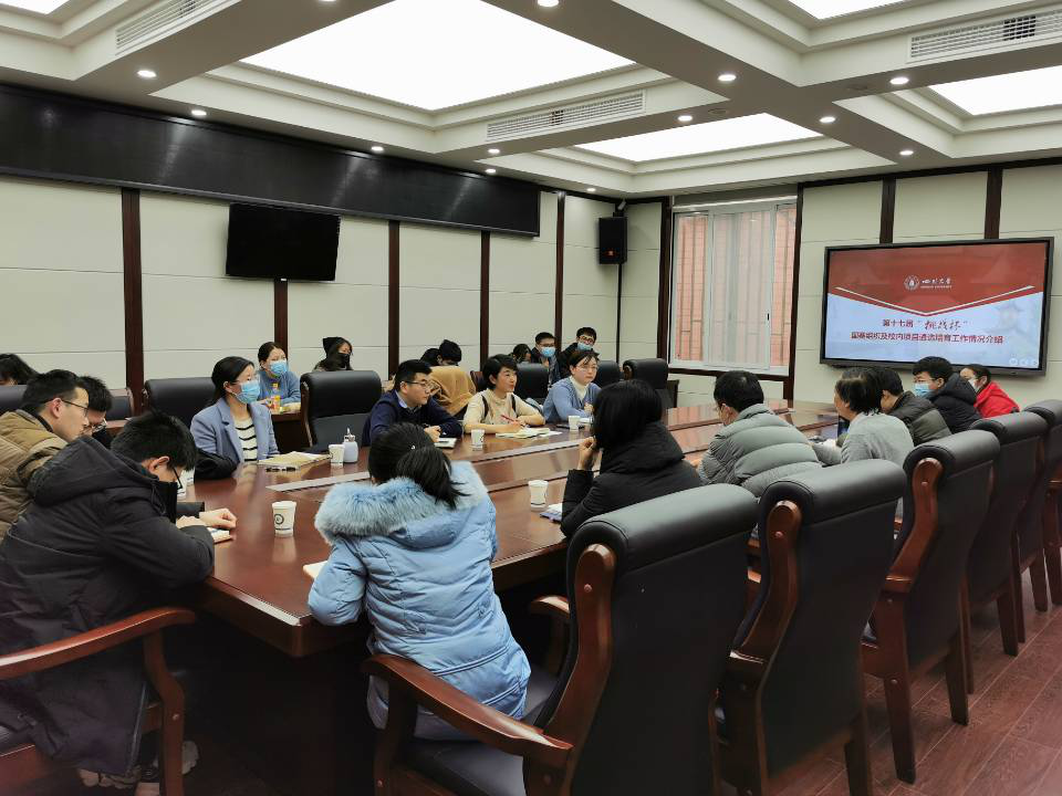 随后,黄书记分别从“挑战杯”大学生课外学术科技作品竞赛(简称大挑)的承办理念、赛事详情及配套活动设计三个方面展开介绍。首先,“挑战杯”大学生课外学术科技作品竞赛有三十余年的历史,以培养“崇尚科学、追求真知、勤奋学习、锐意创新、迎接挑战”的科技创新人才为己任,形成了衔接顺畅、层层递进的校级、省级、国家级三级赛制,逐步发展为全国大学生科技创新领域中层次最高、规模最大、参赛范围最广的“奥林匹克”盛会。其次,本届“挑战杯”具备三个层次上的承办理念:一个主题——书写科创报国的青春答卷,庆祝中国共产党成立100周年;两个导向——以创新驱动发展为引领,培育高水平科技创新项目及以立德树人为根本任务,培养科技报国,创新强国的时代;三个特色——彰显红色文化特色,彰显国际化特色和彰显省市协同办赛特色。再者,“挑战杯”国赛赛事和配套活动设计有三个方面,分别是:主体赛(2020年12月—2021年10月);三项专项赛——“传承红色基因、践行初心使命”红色专项赛(2021年1-4月)、“揭榜挂帅”专项赛(2021年1—10月)、“黑科技”创意设计国际高校邀请赛(2021年1月-7月);四个挑战杯国赛配套活动——青年科技创新服务国家战略和地方发展论坛、红岩烈士“江姐”主题展、大学生科创成果展和成果对接会、成都市新经济“一会一展一感知”实践调研活动。黄菲娅副书记从多个角度全面具体地介绍了本届“挑战杯”的赛前组织及校内项目遴选培育工作的相关事宜,同时对轻工科学与工程学院的宣传动员、优势发挥、谋划组织、政策激励等工作表达了期望。