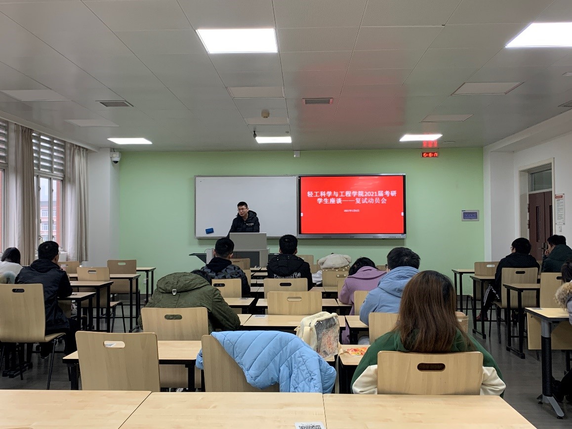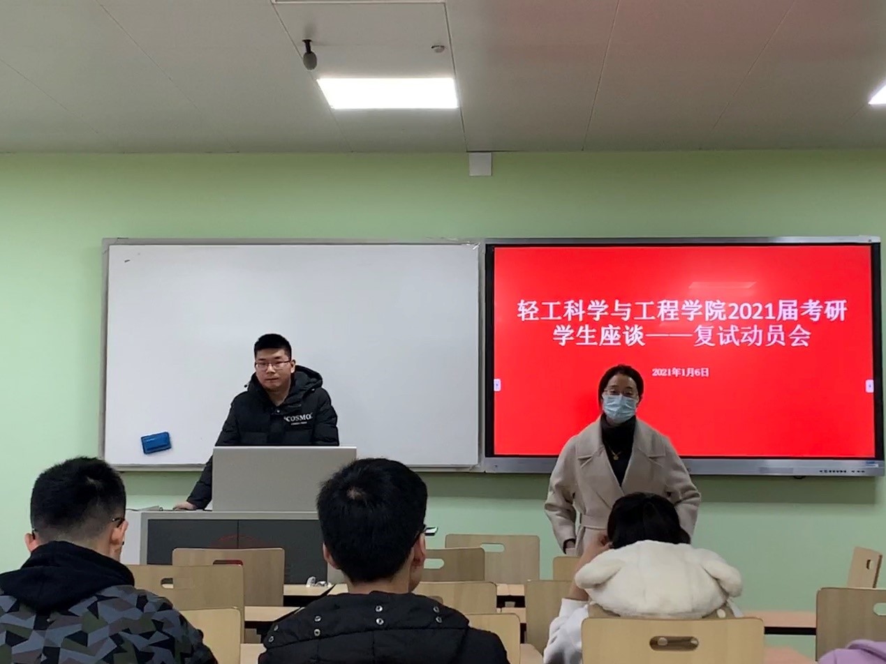 2021年1月6日15:00,轻工科学与工程学院2021届考研学生复试动员会在望江校区基础教学楼A511顺利召开。本次复试动员会由2017级辅导员王舒灏老师向考研学生讲解本届考研形势,研究生小导师任志军同学分享复试经验与建议。