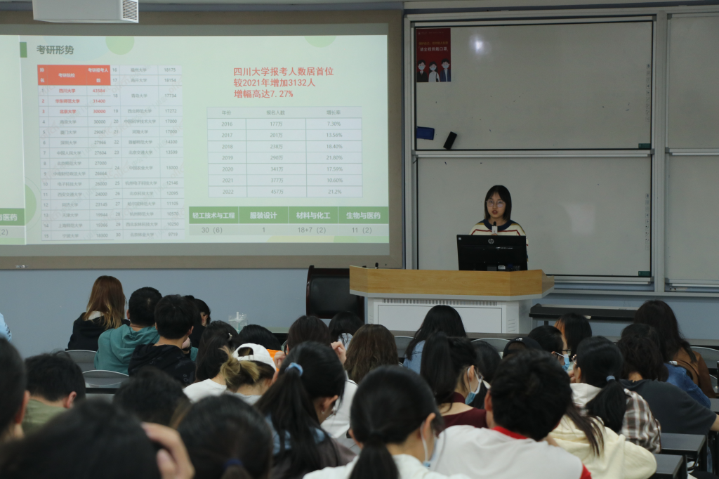 为营造良好班风学风,加强学生对研究生入学考试的认识,帮助学生明确深造目标,激发考研热情并增强考研信心,轻工科学与工程学院思学中心于2022年4月8日下午在江安一教B207教室开展“筑梦考研,扬帆起航”考研经验分享会。本次活动特别邀请2018级学生史雅辰和钟旭斌作为主讲人,2020级辅导员余昕玲老师和2020级全体本科生参加了本次活动。