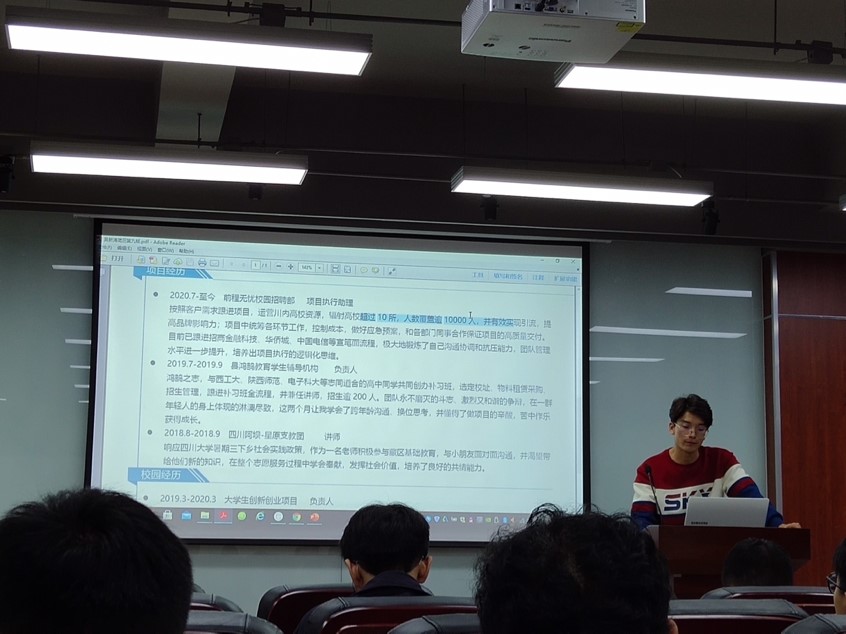 2017级轻化工程专业吴新涛同学主要分享简历的排版与制作,他以优秀学长的简历为参考,直观而又细致地分析了每一份简历的利弊,并建议大家简历排版及内容一定要清晰简约、内容明确。