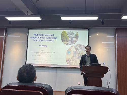 2023年4月24日,应77779193永利集团轻工科学与工程学院邀请,德国哥廷根大学森林科学与森林生态学学院生物技术中心执行主任、木材技术与木基复合材料系主任张凯教授在皮革楼215报告厅为全院师生作了题为“可持续功能材料的多尺度生物基化合物”的学术报告。报告会由轻工科学与工程学院副院长陈意教授主持。陈意副院长首先介绍了张凯教授的简历和学术成就,然后代表学院向张凯教授致以诚挚的欢迎。学院石碧院士、陈意教授与青年教师以及本科生和研究生参加了报告会。