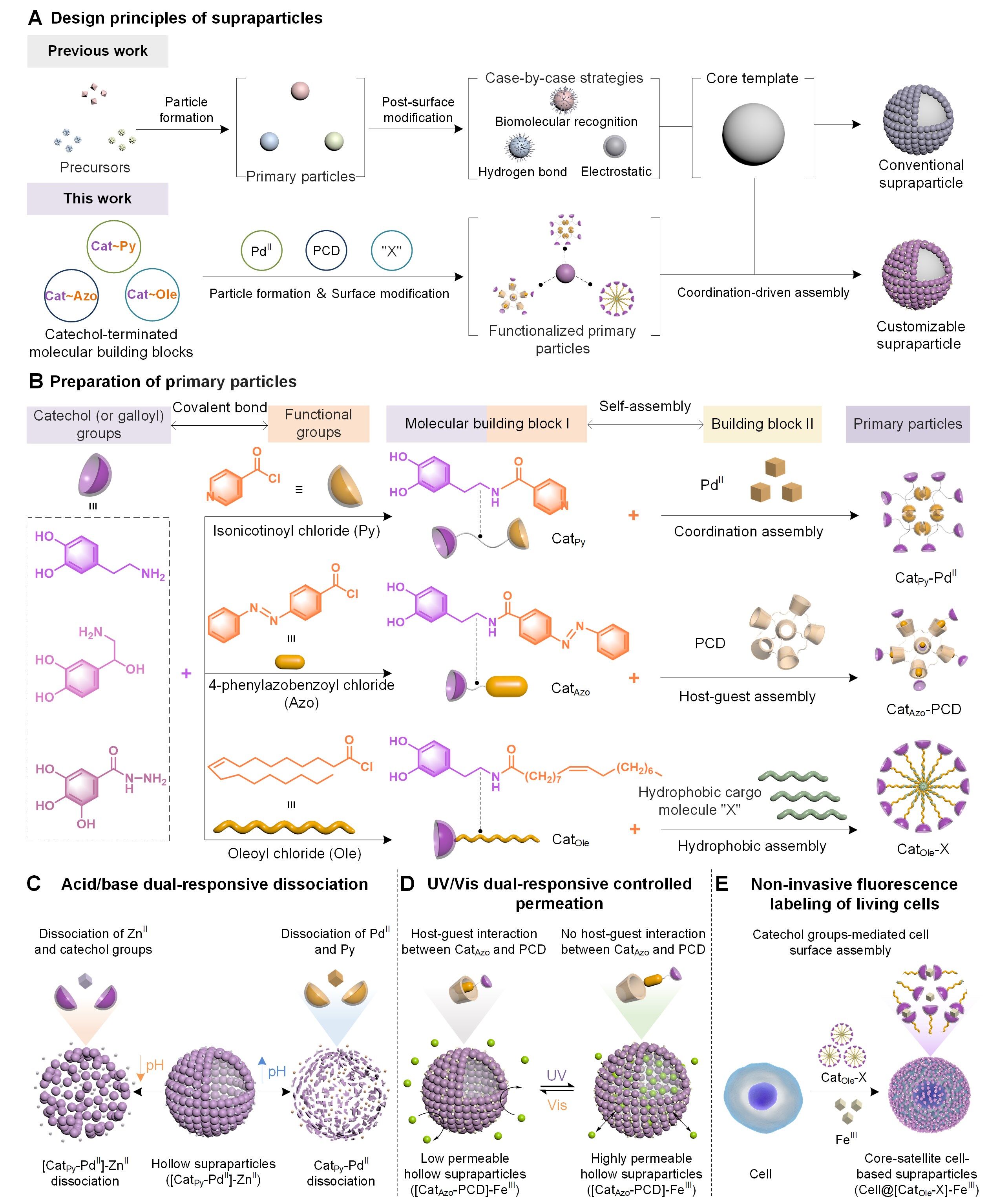 图1. 通过多级组装邻苯二酚封端功能分子单元实现可定制的超级颗粒