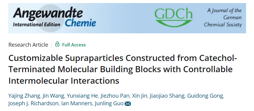 近日,我校轻工科学与工程学院郭俊凌教授团队在国际化学顶级期刊Angewandte Chemie International Edition发表题为:Customizable Supraparticles Constructed from Catechol-Terminated Molecular Building Blocks with Controllable Intermolecular Interactions的研究。多层级自组装策略对于深入理解从分子、纳米到宏观尺度的组装过程具有重要意义,同时也为构筑先进智能材料提供了可靠的途径。随着材料化学的发展,引入纳米颗粒作为基本构筑单元为超结构颗粒的设计开辟了新方向,此类研究多集中于对颗粒表面进行修饰从而赋予颗粒间驱动力以实现自组装。然而,在这些传统方法中,纳米颗粒的合成与表面修饰是分离的两个步骤,很大程度上增加了自组装材料的合成复杂性和应用难度。