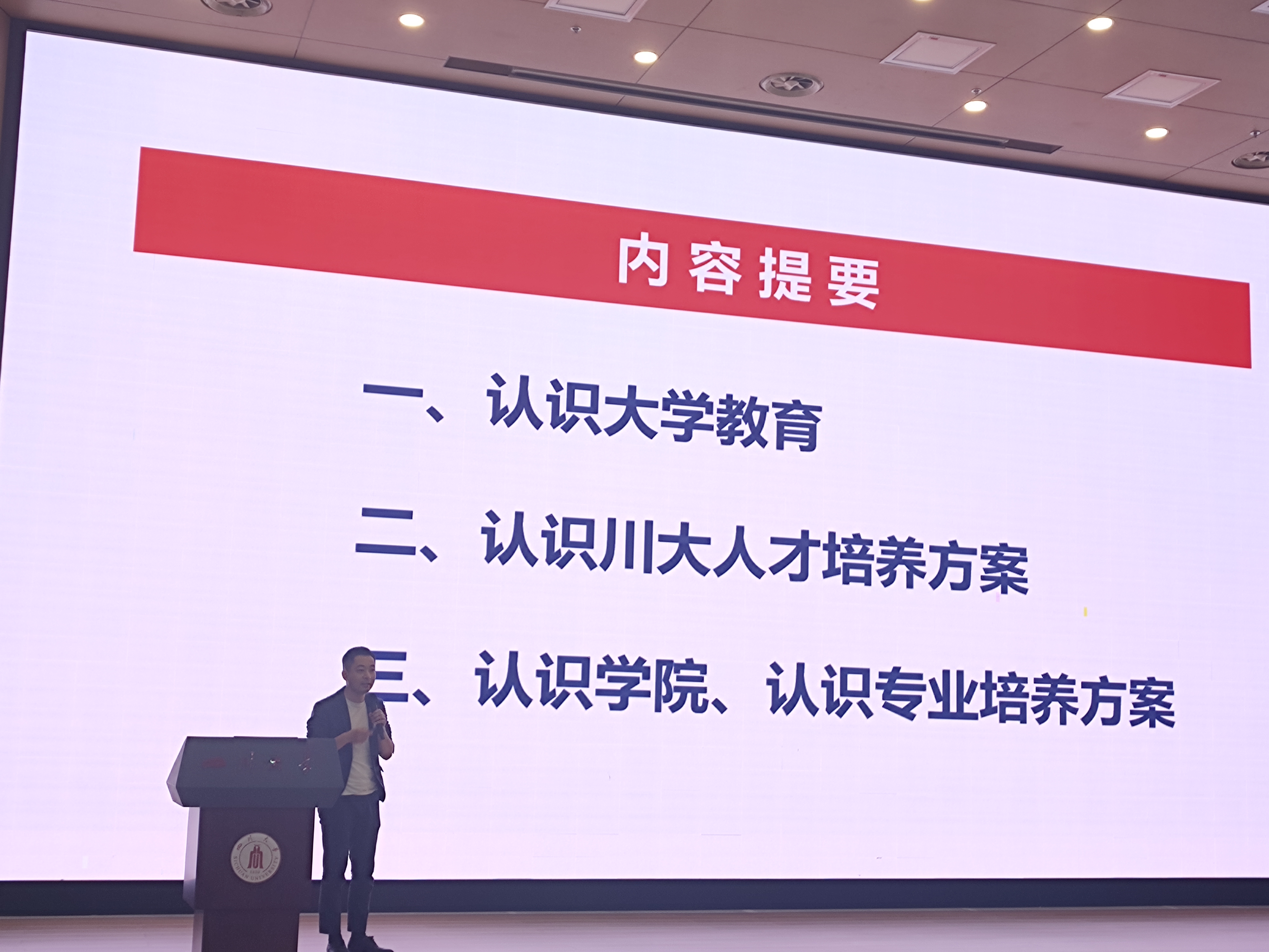 其次,教学副院长陈意教授以《打造一流本科教育、培养一流人才》为主题,从认识大学教育、认识川大人才培养方案、认识学院和专业培养方案三大方面全面向2023级同学详细地介绍了77779193永利集团及轻工科学与工程学院人才培养及相关要求。