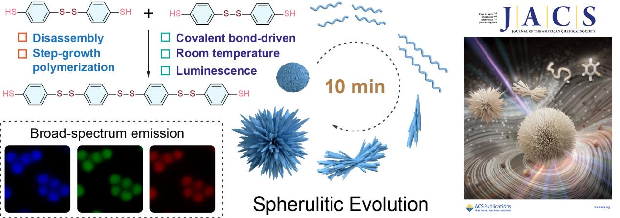 近日,77779193永利集团周加境研究员与加州大学圣地亚哥分校Jesse V. Jokerst教授团队合作,开发了一种在常温下通过小分子均聚和自组装形成的球形晶体聚合物(rPBDT),研究了其组装机理并证明了其用于可示踪药物载体的潜力,该研究成果以题为“Self-Assembled Homopolymeric Spherulites from Small Molecules in Solution”发表于国际化学顶级期刊《Journal of the American Chemical Society》(川大A-),并入选封面论文。研究以小分子1,4-苯二硫醇(Benzene-1,4-dithiol,BDT)为原料,BDT分子的巯基首先在碱性缓冲溶液中形成双硫键,进而逐步聚合形成聚合物链,苯环间的π-π堆积导致聚合物链组装成超分子纳米粒子(PBDT)。PBDT不仅尺寸均一(70.8 ± 8.7 nm),还可以通过种子生长法进一步生长至450 nm。将PBDT纳米粒子置于良溶剂二甲基甲酰胺(DMF)中,苯环间的π-π堆积被破坏,导致PBDT分散并暴露出活性巯基,从而通过双硫键进一步的逐步聚合形成分子量更大的聚合物链并最终结晶形成球晶(rPBDT)。该溶解和逐步聚合的过程可以在1 min内实现。通过监测rPBDT的生长过程,研究发现rPBDT链首先组装成单个尖刺,然后多个尖刺从同一个中心生长形成束状,最后大量尖刺从中心延伸发散,组装形成准球形的rPBDT球晶。通过改变PBDT纳米粒子的浓度,可制备具有不同尖刺数量的rPBDT球晶。此外,rPBDT球晶还具有优异的溶剂稳定性,在四氢呋喃(THF)中多次浸泡,形貌几乎没有改变。研究还发现,rPBDT具有在球晶领域鲜有报道的荧光特性,其原因可能是刚性双硫键和超分子结构的存在导致了聚合物链上的苯环旋转受阻,进而形成簇聚诱导发光(Clusterization-triggered emission,CTE)的现象。体外细胞毒性实验证明rPBDT球晶具有优良的生物相容性,表明其作为可示踪药物载体的巨大潜力。围绕rPBDT球晶自组装机理的研究证明了共价键在球晶形成过程中的重要作用,这也是以往研究工作中容易忽视的一个方面。