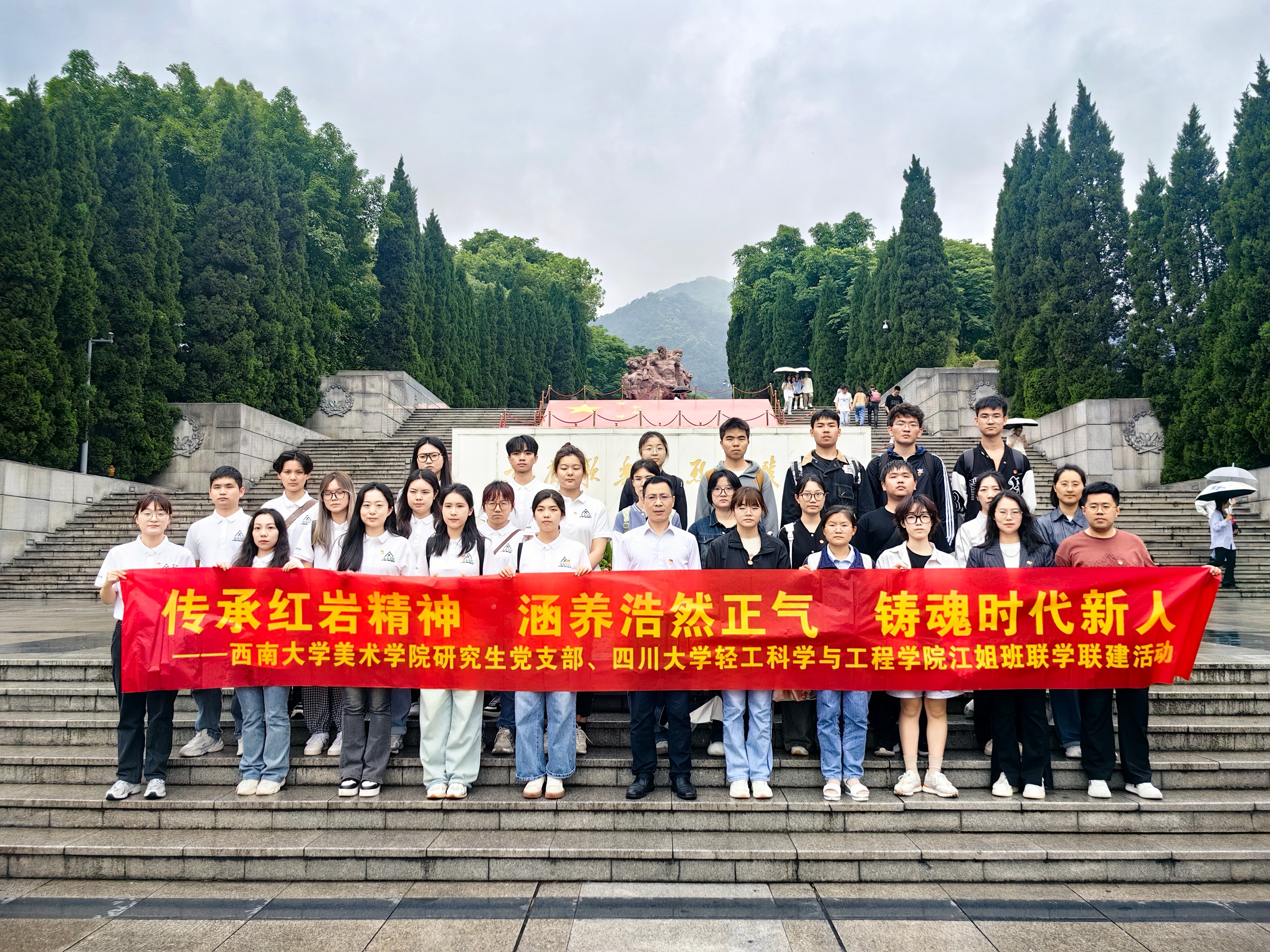 为追寻江姐足迹,学习先辈精神,传承红色基因,2024年5月12日,由轻工科学与工程学院党委副书记冯国涛副教授带队,学院贺婷、王舒灏等老师以及2022级轻化工程103班(江姐班)学生代表赴重庆渣滓洞、白公馆、歌乐山烈士陵园开展红色实践活动,同时与西南大学美术学院团委学生会功能型团支部及研究生党支部开展联学联建活动。