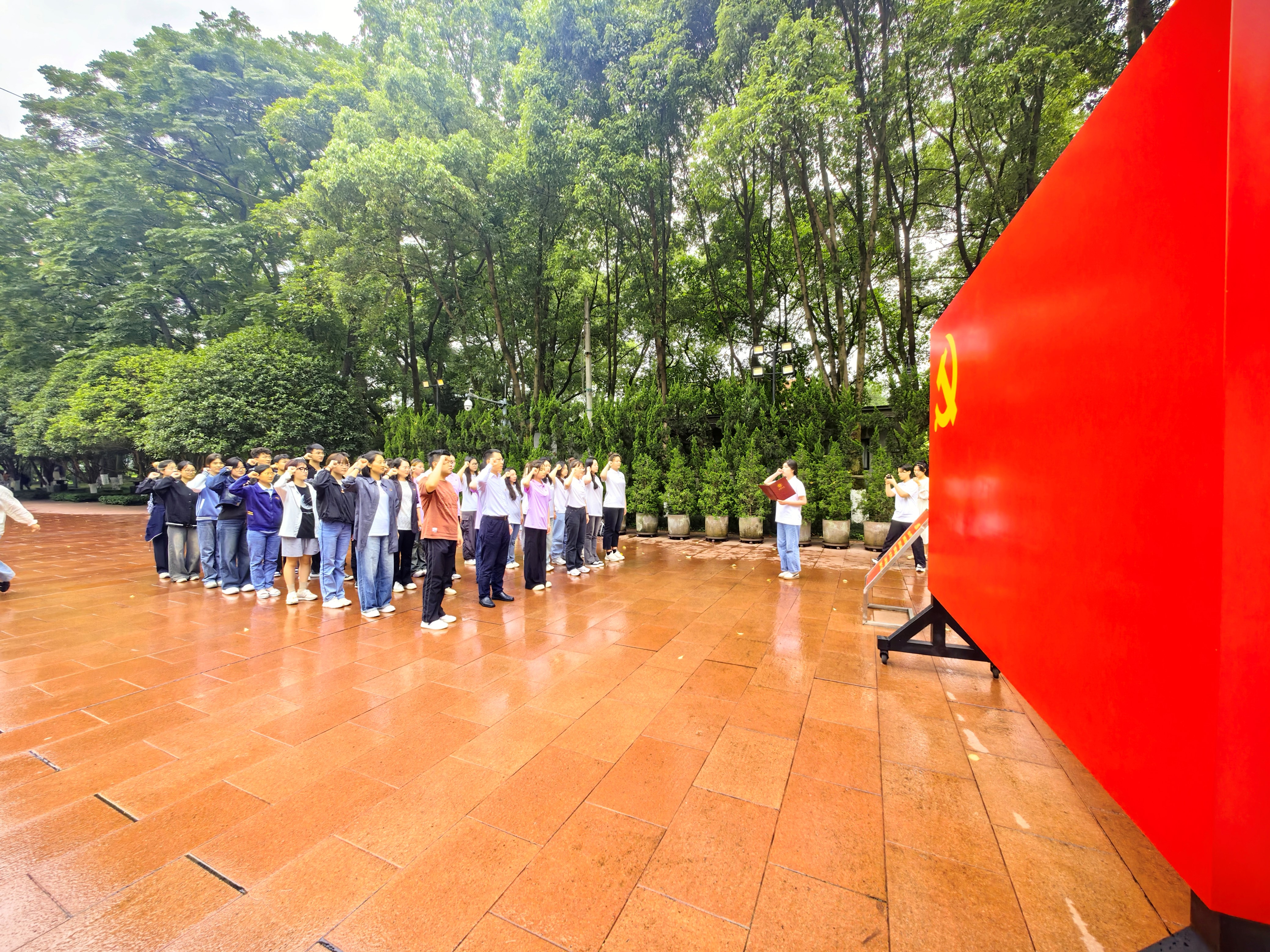 接着,我院师生、西南大学美术学院学生会功能型团支部代表、研究生党支部党员代表前往歌乐山烈士陵园。歌乐山烈士陵园是国民党政府时期“国民党军事调查统计局”的总部、电台、监狱所在地。在参观结束后,我院师生和西南大学美术学院研究生党支部党员代表在党旗下一起重温入党誓词并宣誓。